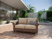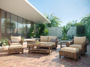 With shapes inspired by indoor pieces and texture informed by tropical living, the Cayman collection brings laid-back comfort with classic design to your outdoor retreat. Seating selections are fully handwoven from banana leaf style resin weave and topped with generously deep dual density foam cushions. The Cayman tables are constructed of hand brushed resort grade aluminum with a handsome faux wood parquet patterned finish.