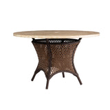Add timeless elegance and long-lasting performance to your outdoor dining space with the Grand Traverse 48” Round Umbrella Dining Table by Lloyd Flanders. Expertly handcrafted in exclusive SunLoom® vinyl, this table offers exceptional durability and a beautifully textured woven aesthetic. Its classic round design transitions seamlessly from sunroom to patio to garden dining, creating a warm and inviting atmosphere in any setting. Available in Caramel or Bisque finishes with a Light Travertine top, this table brings refined charm and versatility to outdoor meals, gatherings, and everyday living.